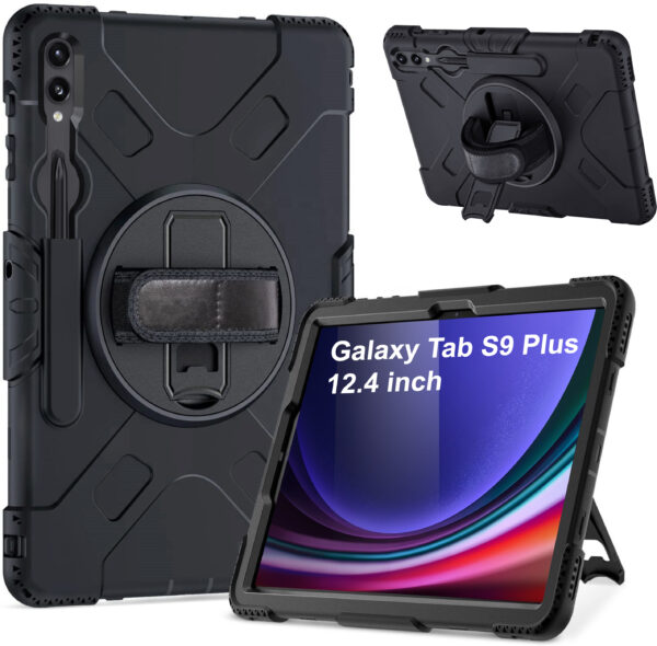 Compatible Model: ONLY for Samsung Galaxy tab S9 FE+ Plus/S9 Plus 12.4 inch 2023 released [Model: SM-X810 SM-X816B SM-X818U SM-X610 SM-X616B] NOTE: Not compatible other model. Please confirm your tablet model before purchase. Rotating Hand Strap / Stand : This 360° Rotating Stand/Hand Strap case for Samsung Galaxy Tab S9 Plus 12.4 inch provides a stable supports, with viewing, drawing, typing angles. You can hold the Samsung Galaxy Tab S9 Plus 12.4 inch safely by one hand and find the most comfortable viewing angle you need. the stand can be folded up when not in use. Perfect Protection : 3 in 1 Design Heavy Duty Shockproof Samsung Galaxy Tab S9 Plus 12.4 inch Case, 2-Layer dual-layer premium hard PC Cover & 1-Layer Flexible Silicone, heavy duty protection case can provide your Samsung Galaxy Tab S9 Plus 12.4 inch against accidental drop , Scratch , Shock, Bump and dirt. Precise Cutouts: Samsung Galaxy Tab S9 Plus 12.4 inch case with precise cutouts, you can easy access all the functions and controls of your Samsung Galaxy Tab S9 Plus 12.4 inch without removing the case, like power buttons, charging ports, cameras, speaker. Pen Holder : Built-in pen holder allows you to store your stylus, preventing it from getting lost (Stylus is NOT included!). Stand-fold design is super convenient for providing different viewing angles when watching videos, texting, gaming or learning etc.